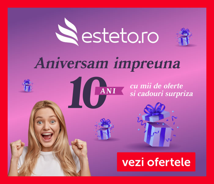 In perioada 8-31 martie este activa pe site campania aniversara Esteto 10 Ani. Pe langa preturile reduse la o gama variata de produse, clientii care plaseaza comenzi cu o valoare mai mare de 200 lei beneficiaza de un cadou surpriza.