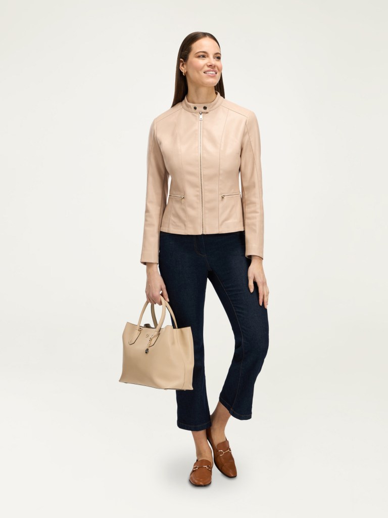 Jachetă din piele artificială moale, de culoare uni; croială îngrijită, fermoare metalice, căptușeală ton pe ton; inserții de jerseu pe mâneci pentru confort.
