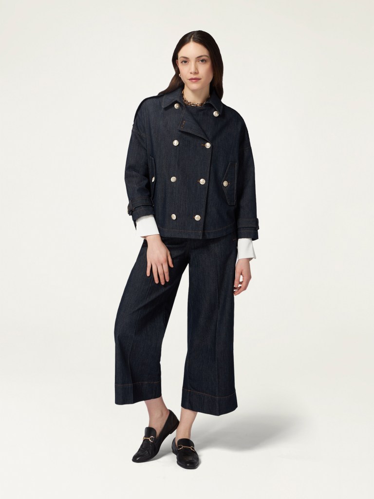 Trenci scurt, boxy, din denim din bumbac elastic, decolorat albastru închis; inchidere la doua piept cu nasturi in stil cresta aurii; Clape pe umeri, buzunare înclinate în față și tiv rotunjit.