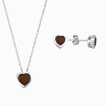 Set argint ornat cu piatra naturala granat – inel, cercei, pandantiv – si pietre de sinteza cubic zirconia albe. Piatra granat taiata in forma de inima, este simbolul pasiunii – un cadou inedit pentru persoana iubita.