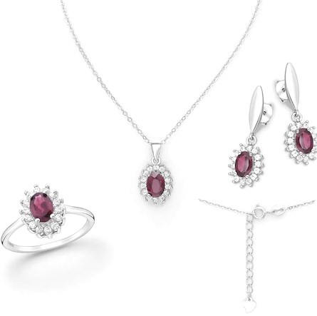Set bijuterii argint – inel, cercei, colier – ornat cu pietre naturale rodolit si pietre de sinteza cubic zirconia albe. Rodolitul este un tip de granat de culoare rosu-trandafiriu, care are un ton mai deschis si o nuanta mai purpurie decat pietrele semipretioase de granat.