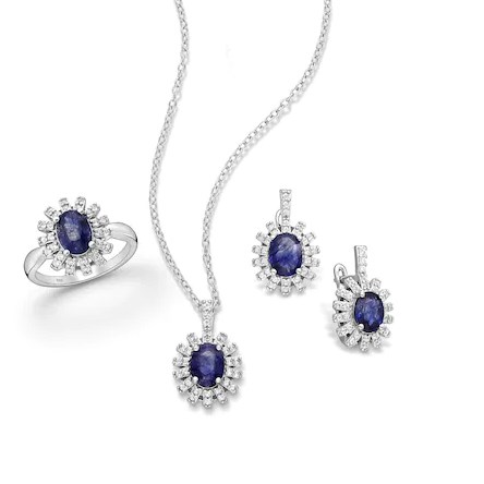 Set festiv impresionant de cercei si pandantiv din argint 925 cu placare cu rodiu. Modelul seamana cu o margareta cu un safir oval fatetat, in jurul careia sunt incrustate mici pietre de topaz alb.