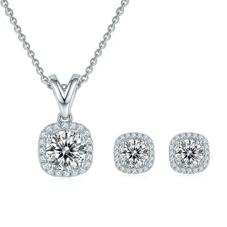 Set Colier si Cercei cu diamant Moissanite prelucrat in laborator. Studiile arata ca diamantele Moissanite stralucesc mai puternic decat cele naturale si sunt eco friendly.