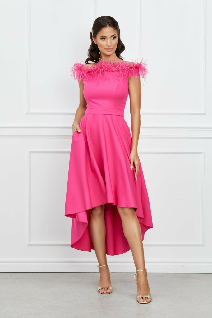 Rochie eleganta de ocazie accesorizata cu pene la bust. Are decolteu drept, umeri goi cu manecute lasate, croi clos si lungime asimetrica.