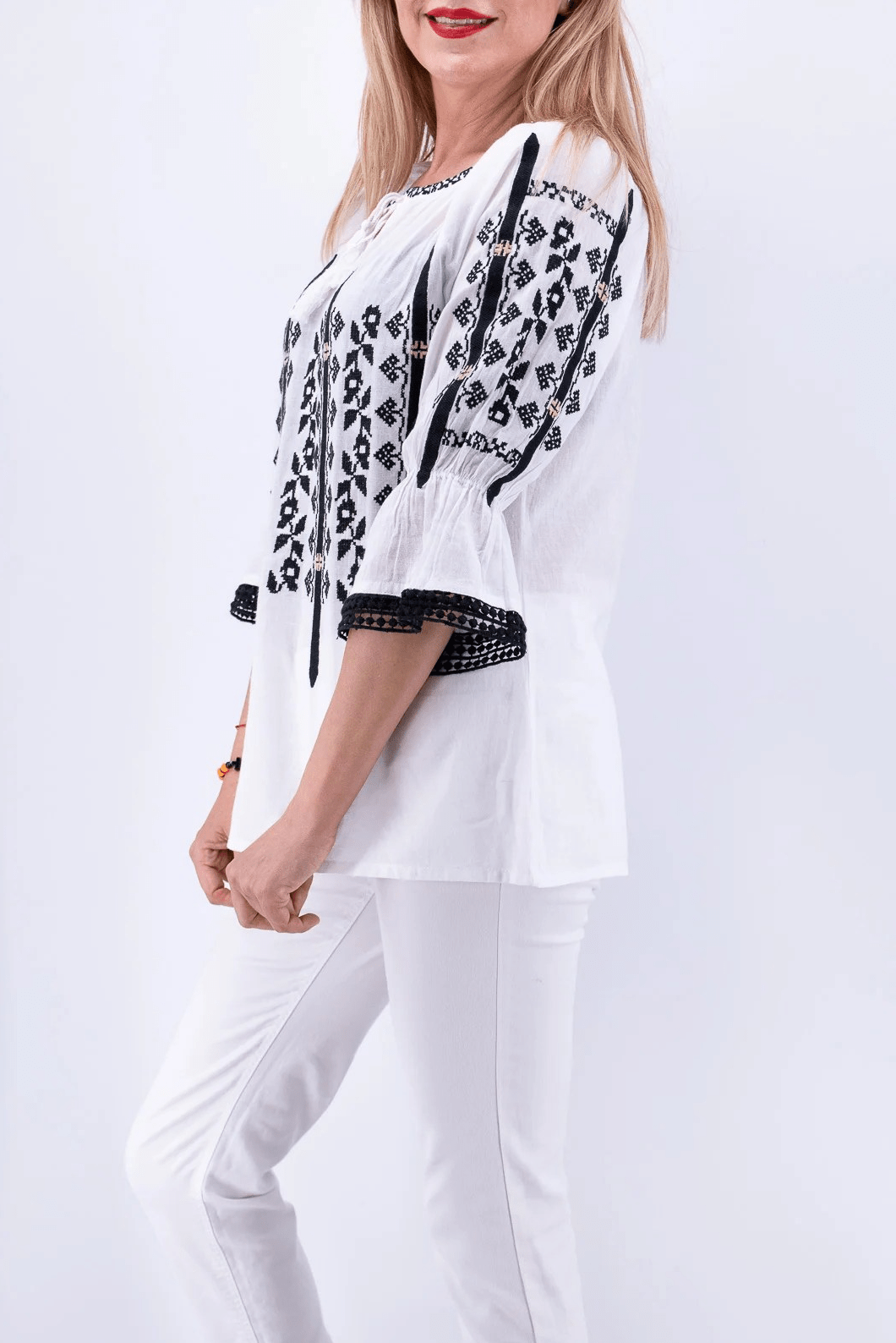 Ie din pânză de bumbac 100%, Broderie cusută la mașină. Culoare: alb cu broderie negru și crem.