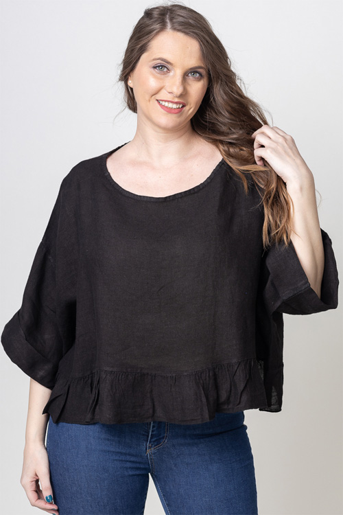 Bluza din in cu volanas, oversize, neagra