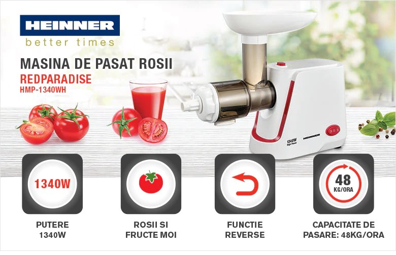 În ansamblu, mașina electrică de tocat roșii și fructe moi – Heinner RedParadise HMP-1340WH – îți poate oferi multiple funcții practice care ușurează activitatea în bucătărie.