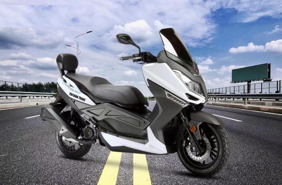 Greutatea proprie de 146 kg și capacitatea maximă suportată de 150 kg permit transportul unui pasager și al bagajelor fără compromisuri. Roțile din aluminiu, de 14″ pe față și 13″ pe spate, echipate cu anvelope 120/80-14 și 130/60-13, oferă stabilitate și aderență optimă. Frânele hidraulice pe disc, atât pe față, cât și pe spate, asigură o oprire sigură în orice condiții.